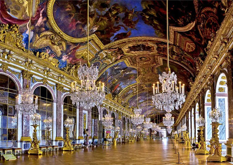 Возможно, самый известный дворцовый интерьер эпохи барокко. Золото, хрустальные люстры, зеркальные арки слева для создания иллюзорного пространства.