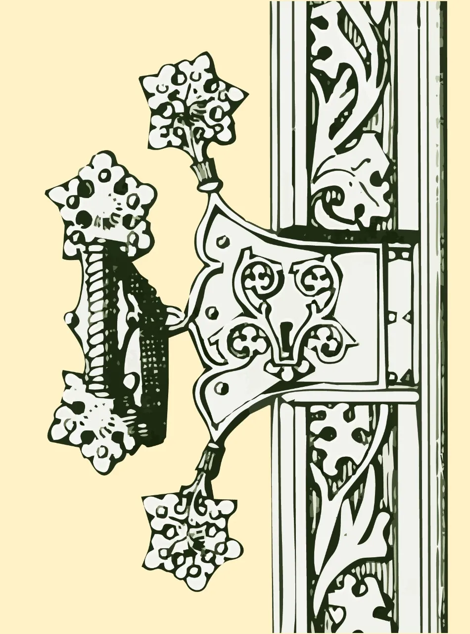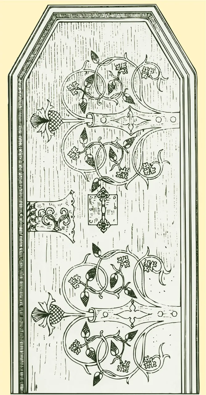 Очень характерные для зрелой и поздней готики крепления петель с растительным орнаментом, расходящимся по полотну двери.