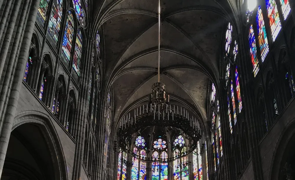 В интерьере готика продолжает эстетику, которую мы видели на фасадах. Стрельчатые арки и вертикали доминируют, устремляя взгляд вверх. Вертикальные опоры на самом деле довольно мощные и толстые, но они рисуются как пучок тонких легких колонн, чтобы казаться гораздо легче. Свод в готике тоже каркасный, как и стена. В нем выделяются нервюры - более толстые “струны”, которые держат на себе основную нагрузку. Пространство между ними заполняется более тонкой каменной кладкой. Такой свод гораздо легче, чем толстый и мощный романский свод, поэтому он меньше давит на стены.