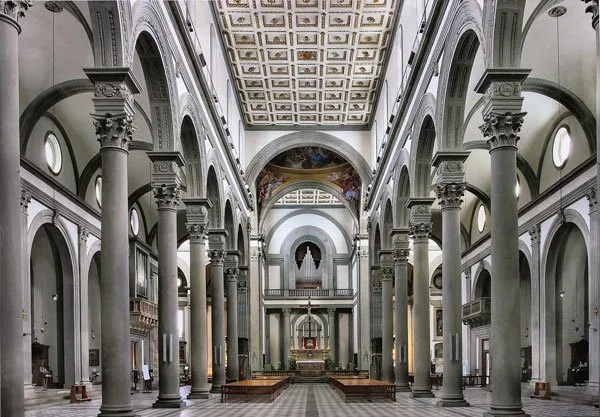 Чистых ренессансных интерьеров не так много. Хороший пример - базилика Сан Лоренцо во Флоренции. Простая геометрия (арки, прямые линии, круги) и практически минималистичное цветовое решение.