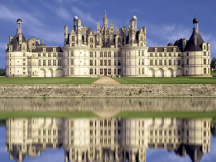 Вот французский замок Шамбор с типичными для Франции мансардами и башенками на высокой крыше. При этом можно увидеть вполне ренессансные приемы - стена разлинована колоннами и карнизами.