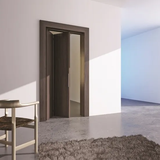 - Межкомнатные двери-книжка. Двери складываются наподобие книжных страниц, что занимает меньше места. Используются в небольших помещениях или при необходимости быстро разделять пространство.